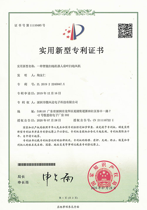 我司自主研发的智能扫地机器人风机系列产品荣获国家实用新型专利证书4项专利,外观设计专利多达8项,还有扫地机器人吸尘风机马达结构实用新型专利等,公司研发实力的增强,新材料、新结构、新技术、新工艺的不断研发应用到产品中,更好的服务于客户,为客户创造更多价值,超越客户的期望。